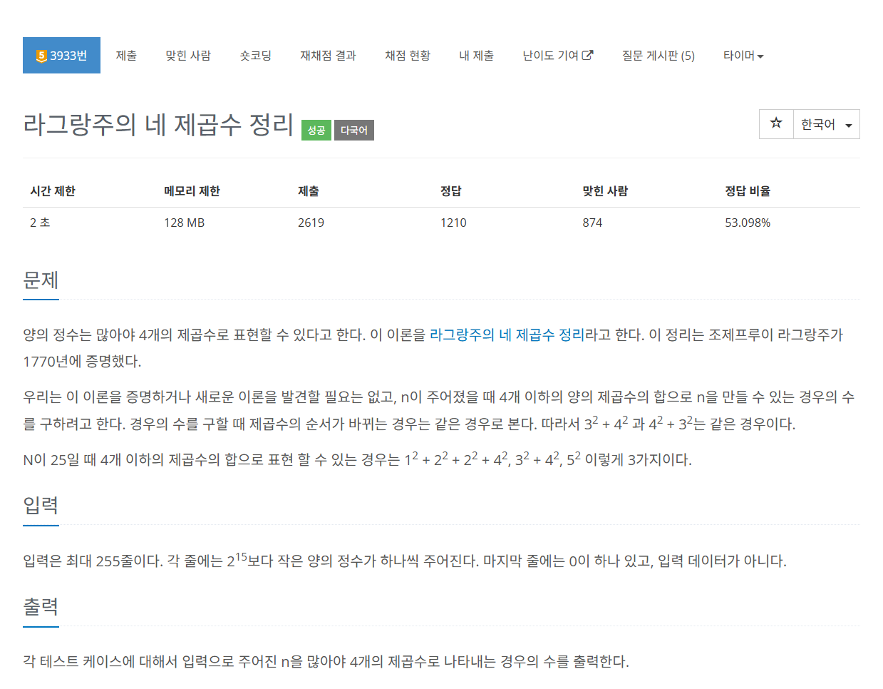 #문제 간단 정리 브루트 포스인데 전처리를 해주자 dp개념도 좀 들어간다고 할 수 있을 것 같 #문제 해결 방법 우선 키 포인트가 되는 아이디어는최대 4개의 제곱수를 만들고입력은 2^15 정도가 들어오니즉 2^15 약(40000) 이하를 만드는 것인데200^2 는 40000 이니까 ㅁ + ㅁ + ㅁ + ㅁ이런 각자리수의 제곱에최대 200까지만 들어올 수 있다는 것이다.때문에각각 (1~200) ^ 2 로 전처리를 해주면된다시간복잡도는 약 200 * 4 정도니 충분하다. #전체 코드#include #include #include #include #include #include #include using namespace std;typedef long long ll;vector dp;void dfs(int l..
