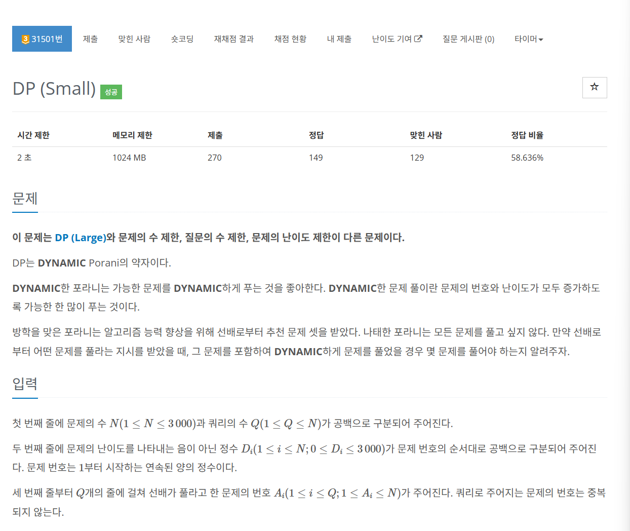 #문제 간단 정리 다이나믹 프로그래밍 + LIS활용 #문제 해결 방법 문제 서술이 조금 복잡하게 되어있지만 결국에 그 문제번호가 포함해서 가장 긴 부분수열 ( 난이도 증가) 를 알고싶다는 것이다. 기존의 LIS dp는 2중반복문을 사용했을때 dp[i] 에는 난이도증가하는 가장 긴부분수열이저장된다때문에 반대로 난이도가 하락하는 부분수열을 dp2[i]로 구해준뒤에두개를 더해주면 된다 LIS 를 잘 기억하고있으면 쉽게 응용해서 풀 수 있다. #전체 코드#include #include #include #include #include #include #include using namespace std;typedef long long ll;int n, q;int main() { ios::sync_with_..