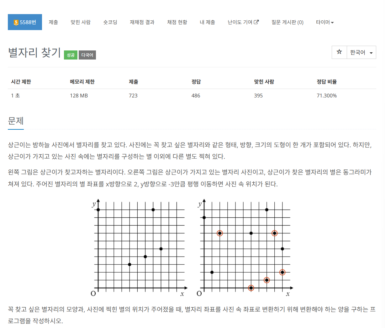 https://www.acmicpc.net/problem/5588#문제 간단 정리 브루트 포스 문제 #문제 해결 방법 우선 m이 200 n 이 1000이라서 브루트포스가 가능한게 눈에 보인다 우리가 찾고있는 별자리의 첫번째 값을 우리가 가지고 있는 별자리에 (사진 속) 모두 차이를 구하면그중에 하나는 정답이 있을 것이다. 때문에 그 차이값들을 전부 찾고있는 별자리에 더해줘서사진속에 전부 존재하는지 확인해 주면된다. #전체 코드#include #include #include #include #include #include #include using namespace std;typedef long long ll;vector> ori_star;set>my_star;vector> diff;bool findM..